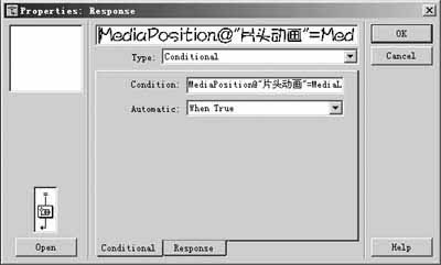 GetSpriteProperty(@"Flash",#playing)=FALSE程序流程为退出交互,当Flash动画正常播放完毕,条件为真(When True),此时程序自动进入主程序窗口;另一个设置为热区交互,里面放置一个计算机图标:CallSprite(@"Flash",#stop),此时的热区当然设置为屏幕的所有区域,这样用户在任意屏幕位置都可以单击响应了。
