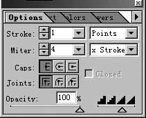 浮动面板(图2)。在浮动面板上有四个标签——Text(文字)、Layer(层)、Color(颜色)、Option(操作)。其中Text(文字)、Layer(层)、Color(颜色)面板的参数设置和Photoshop 差不多,这里就不详细说了。我们来看看Option(操作)这个面板。Options面板中包含了边线的参数调整。Stroke用于调整边线的粗细;Miter用于调整转角的角度;Caps中的三个按键用于调整线段端点的形状;Joints中的三个按键则用于控制转角的形状;后面的Close选项用于控制封闭图形是否封闭;Opacity用于调整线条的透明度;最后一个滑动杆用于调整线条的抗锯齿的程度。
