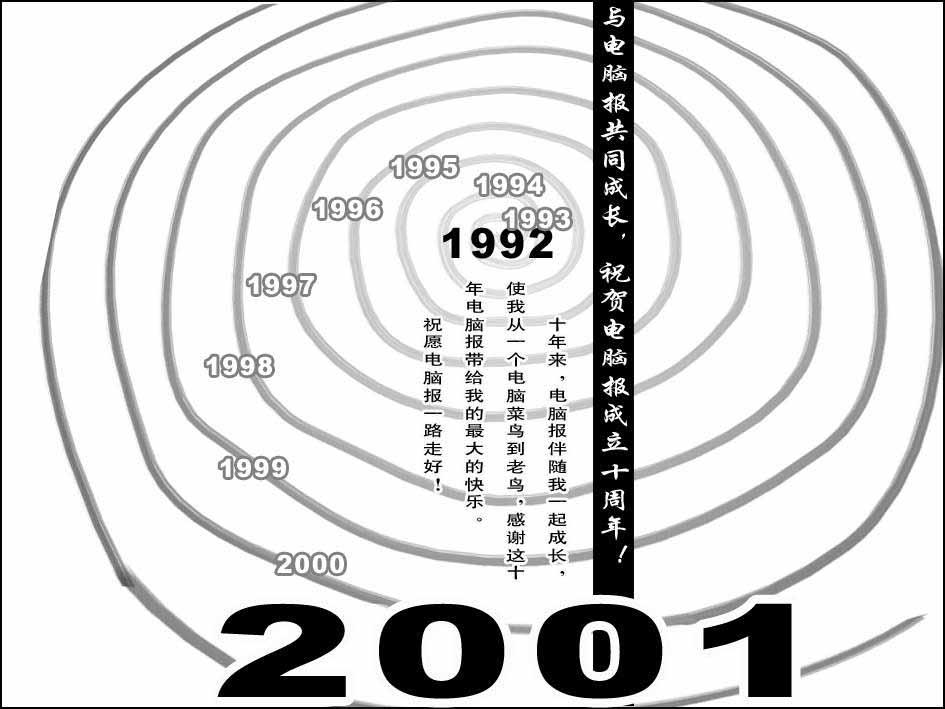 这幅作品在创意上非常不错,通过由浅到深的树轮方式表达了十年,主题通过醒目“黑底反白字”的方式 放置于画面的近黄金分割的位置,符合人们的视觉习惯。画面的1992和2001醒目的粗黑体表明了电脑报的从诞生到现在的年份,点名了主题。其中1993到2000之间的字体采用淡化处理放置于画面的左边,与后边的“黑底白字”很好呼应,达到了画面的均衡。