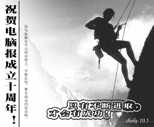 这幅通过一个大树表现电脑报十年发展的创意很有新意。通过简洁的制作突出了表达的主题。但得说明的是,电脑报集团已经是四报十六刊了。呵呵,看来作品中的这棵树还应该更大些。