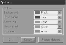 )。这里能够让你查看当前播放文件的信息,控制对文件的播放和停止,可以调整音量和重音,显示播放列表和滚动显示歌曲标签信息等。在每个面板最左边有个显示/隐藏按钮,可以用于切换面板的显示状态与隐藏状态。另外,你还可以自定义Dice VQF Player的颜色,在该播放器任意位置点击鼠标右键,从弹出的菜单中选“Options”(选项)面板(图2)(