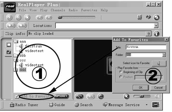 1中②所示的窗口:在“title”(标题)栏输入歌曲名或影视名,在Folder(文件夹)中选择存放该媒体文件的文件夹,单击“Select icon for favorites”右边的图标,有42种图标来设置你的媒体文件的图标第四项是“play favorities form”,它有两个单选框,“Beginning of clip”表示文件从头开始播放,“Position”表示从正在播放的当前位置开始播放,后面的时间是按下“Add to Favorites”后已播放的时间。设置完成后,按“OK”。展开文件夹,刚才设置的媒体文件标题已加入收藏夹了。重复以上步骤,将所有的媒体文件加入收藏夹。
