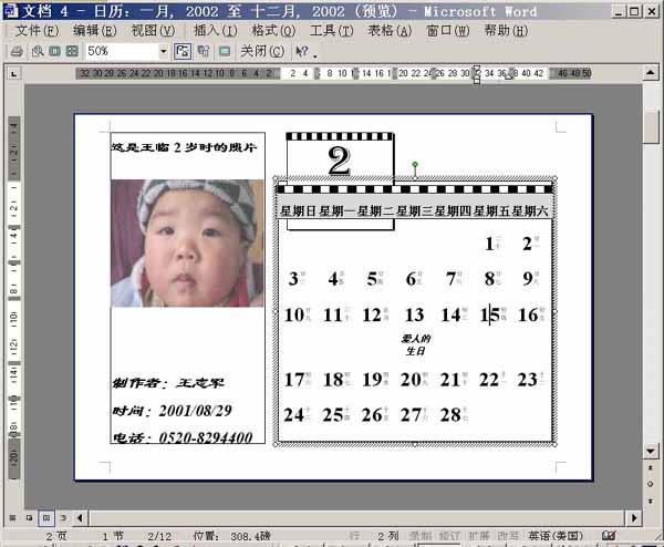 将光标定位于图片任意部位,可以看到图片实际上是处于一个图文框中,将原来的图片删除后就可以重新插入自己所需要的图片。笔者这里选择了宝贝儿子2岁时的照片。并且还在空白之处插入了一些文字,至于字体的格式嘛,就由你自己去调整,反正与普通文档中的格式设置没什么区别。