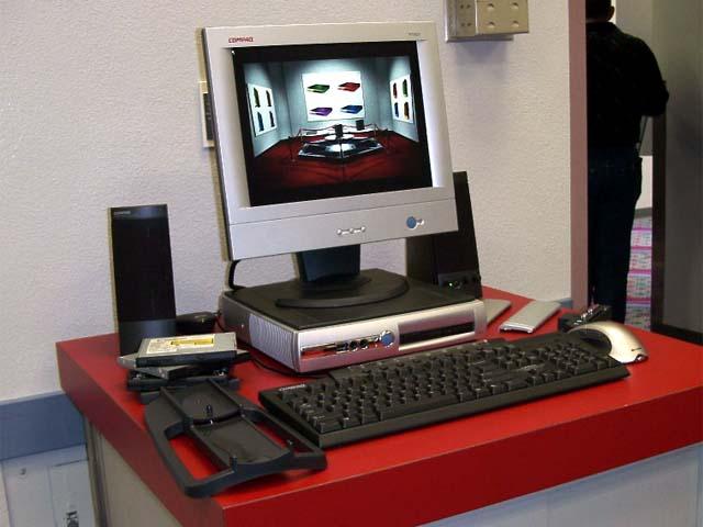 康柏(COMPAQ)展出了旗下第一款采用超薄Slim设计的Evo D500 Ultra-Slim桌面机,这款Slim电脑配置了英特尔Northwood核心的Pentium4处理器和Brookdale-G芯片组主板。全机尺寸宽度32cm、长度33cm、厚7cm,机箱外侧配备了搭载超薄驱动器的Multi-Bay与IEEE 802.11b无线LAN模块和Multi-Port扩展端口。(