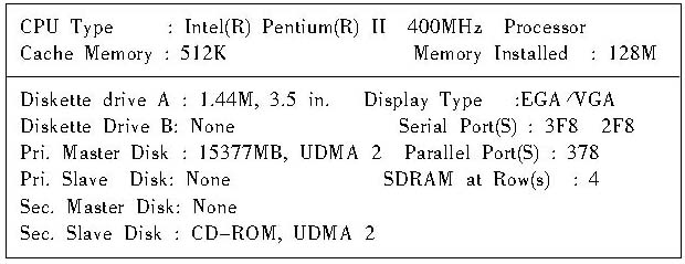 首行是CPU的类型及外部时钟的检测报告,这里是主频400MHz的Intel PentiumⅡ CPU;
