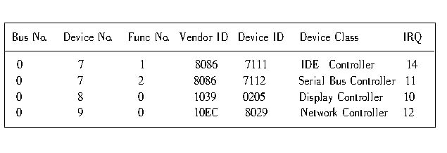 显示PCI设备的名称、总线号、设备号、占用地址、占用中断号等信息,其中重要的是IRQ信息:IDE接口使用的是中断14;串行口(Serial Bus Controller)使用的是中断11;显示控制器(Display Controller)设备使用的是中断10;网络控制器(Netword controller)使用中断12。这些信息可以提示你在安装其它设备时避开这些中断的使用,以免冲突。