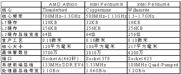 目前市场上能与Pentium4相抗衡的主要是AMD的雷鸟(Thunderbird)处理器和英特尔最新的Tualatin核心的PentiumⅢ。尽管在某些应用上还有不足,但Pentium4肯定是目前综合性能最好的CPU。下面我们给出Pentium4与其他处理器的一些技术参数比较情况(见表