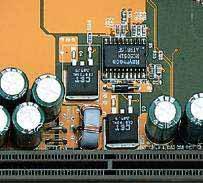 )把电源输入的3.3V~12V电压转换到1.65V~2.0V电压供CPU使用,它输出电流的能力可以达到十几安培,应付Intel的Socket CPU是绰绰有余。但是随着AMD的GHz SocketA CPU出现,情况就有了改变,目前最新一代的CPU比起三年前的CPU电流增加了9倍,达到了41A之多。更低的电压要求、更高的电流输出、更快的升级换代要求主板厂商拿出合乎经济标准的新型电源设计。