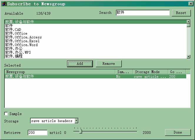 当设置妥当后,点击工具条中连接图标或在软件启动时自动连接服务器,即可下载服务器上的新闻组组名并马上显示出来。我们可以在“search”区域输入Group的名称的部分或全部,就能快速找到该新闻组,按“add”即可添加到预订区域。另外,你还可以设定该组的下载方式是save article header仅下载文章标题)还是save article bodies标题、正文一起下载),在“retrieve”区域可输入每次下载该组的最大标题(正文)数目。如此即可完成一个Group的预订工作,要预订多个Group则重复上述工作。当一切完成后,按“done”完成预订新闻组(