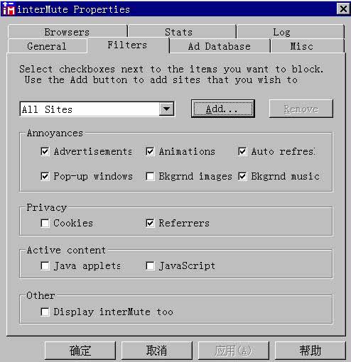 ),在这里设置你希望对哪些站点执行什么过滤操作,默认情况是对所有站点 (All sites)执行过滤操作。过滤类型主要有以下几项: