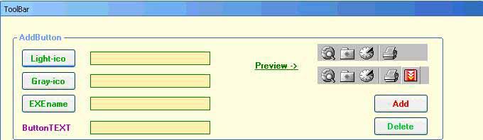 ),我们看到在“AddButton”项目下有几个按钮。其中我们点击“Light-ico”按钮为所添加的应用程序选择一个高亮度显示的图标按钮;点击“Gray-ico”按钮为应用程序选择一个暗色显示的图标按钮;点击“EXEname”按钮则可以选择应用程序所在路径;最后在“ButtonTEXT”文本框中输入鼠标置于程序按钮上的提示文字。