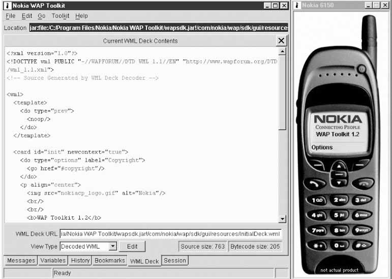 )3)。这个软件左边是编辑栏,可以书写WML,右边则是Nokia手机的模拟图及显示的左边WML内容的式样。Nokia的WAP工具包含有图形开发环境,浏览器和WML/WMLScript编译器。Nokia工具包目前只能在Windows NT4.0或Windows 2000上运行,但是要注意的是Nokia WAP Toolkit需要首先运行Java 2 runtime才能使用,所以你需要先到Sun’s Java 网站去下载一个Java 2 SDK或者Java 2 Runtime Environment(JRE)才可以安装使用Nokia WAP 工具包。