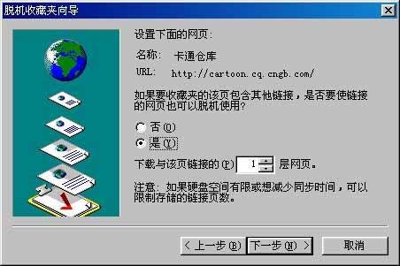 ),在这里可以选择保存的快捷方式在收藏夹中的位置和名字,而那个“允许脱机使用”的选项,则是离线浏览的关键所在。选定它,后面的“自定义”按钮就由灰变黑,表示可以使用了。点击后,如果是第一次使用,就会出现“脱机收藏夹向导”的简介屏幕,直接点击“下一步”按钮,就可以看到最基本的选择菜单(