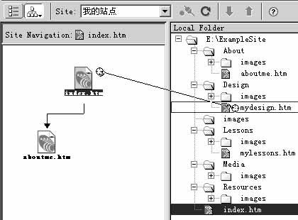 1.使用网站地图可以快速制作网站雏形,并可以方便地在个页面之间加入导航链接。首先按如下图标“Map and Files”打开站点地图窗口;选中index.htm文件;点击并拖动站点导航(Site Navigation)窗口中index.htm文件右上角的小圆圈,将它拖动到左边文件窗口中的某一个文件上,
