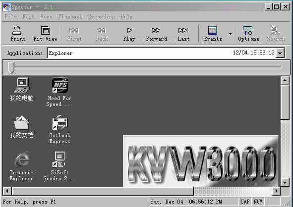 )用鼠标点击进行转换。当在“Events”下级菜单中选择“Applications”项时,如图4所示,“事件”显示框中列出了当时运行的程序,鼠标点击“Forward”按钮,可以查看不同时间内正在运行的程序。当在“Events”下级菜单中选择了“Chronological”项时,“事件”显示框中显示记录结果的时间范围,即在哪一段时间内,“拍摄”到图像。如果选择“Internet Sites”或者“Keystrokes”项,可分别在“事件”显示框中显示访问的网址或键盘的输入情况。
