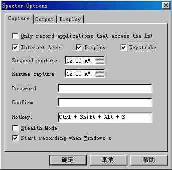 在“Capture”标签上部为监控内容设置,选中“Internet acce”项,则对上网活动如上网浏览、聊天、收发“伊妹儿”进行监控;如选中“Display”项,会对屏幕进行监视“拍照”;选中“Keystroke”项,会对键盘输入情况进行记录。我们可根据实际情况选择,如果只需要监控上网活动,则仅选择“Only record applications that access the In”项。