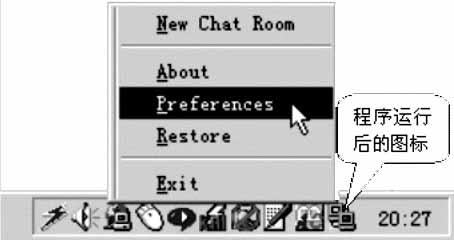 在图1中的程序图标上单击鼠标右键会出现如下菜单,在此可新建聊天室(New chat room),也可进行该软件的参数设置(preferences),出现