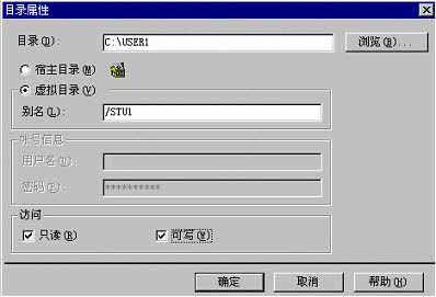 5.WWW服务设置。在图1中,点击WWW服务的图标,在“目录”项中,添加一虚拟目录,即已建立的USER1,别名可以就叫“STU1”。注意浏览的默认文件名,一般都为“index.htm”(如