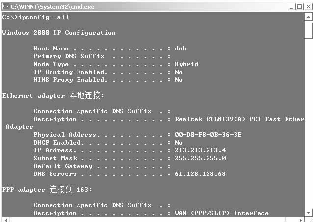 1.在Win 2000下,已经没有“winipcfg”命令,但是你仍然可以通过“ipconfig”命令来获取网卡的MAC地址信息,方法是首先在运行中输入“cmd”,回车,进入命令行方式,然后输入“ipconfig -all”(此命令在Win 98和Win ME中也可使用),你就可以找到网卡的各项信息,如图(