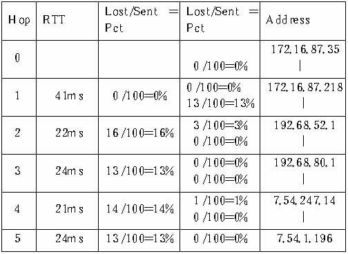 图中显示的链接(在Address列中以“|”标识)数据包丢失率指出在该路径上由于链路拥塞而导致数据包的丢失情况。表中显示的路由(由其IP地址标识)数据包丢失率指出路由器的CPU或本地数据包缓冲区可能超载。