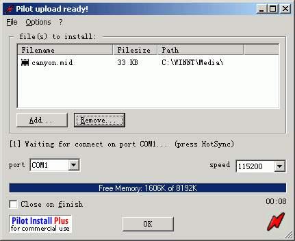 在基本的设置结束之后你就可以按“Add...”按钮来添加欲安装的程序了。如果需要一次安装多个文件,可以使用拖动的方式进行安装,方法是先选中所有需要安装的软件,然后用鼠标将它们拖动到Pilot Install的窗口中就可以了。 如果你要删除文件列表中的某个程序,可以先选中它,然后点击“Remove...”按钮即可。最后,把欲安装的软件都添加到列表中之后,按一下同步座上的同步按钮就可以开始安装软件了。在安装的过程中Pilot Install会通过安装进度条来显示安装的进度和安装所需的时间。如果你希望在安装结束后关闭Pilot Install可以将Close on Finish项打上钩。