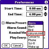 也许你早就听烦了Palm中那几种单调的铃声,可不可以换些有个性的呢? 答案是肯定的,这一点Pilot Install可以帮你轻松搞定,直接把MIDI文件与Palm同步就可以了。同步完之后如果要使用这个MIDI文件请进入Date Book选择“Option”→“Preferences”将Alarm Sound设置成你安装的MIDI文件就可以了(