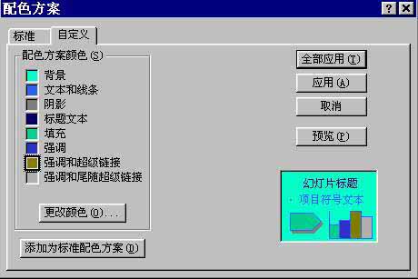 4所示。单击“全部应用”按钮,以后所有超级链接的文字都以此颜色出现。其它各项内容提要都进行同样步骤的设置后,把视图切换至“幻灯片视图”,就看到如