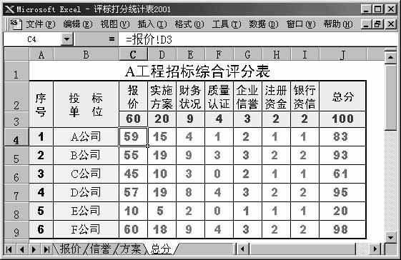 (2)报价、实施方案、企业信誉均引用前面工作表中数据,如A公司报价单元格公式应为“=报价!D3”。