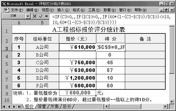 (3)根据计算公式,A公司得分公式应为“=60*(1-(C3-$C$9)/$C$9))”,但需要考虑几个特殊情况,一是如果结果小于10,应显示10;二是如果某公司弃标,报价为空时,得分应为0,决不能将弃标按报价最低错算成60分;三是当某公司报价为0时(发生的可能性很小),计算结果中不显示出错信息,而显示0;四是复制公式时,最低报价单元格不应发生变化,应进行绝对公式引用;根据这四个方面,A公司得分公式将应用到三层if嵌套,应为“=IF(C3=0,,IF($C$9=0,,IF(60*(1-(C3-$C$9)/$C$9)<=10,10,60*(1-(C3-$C$9)/$C$9))))”,请感兴趣的朋友仔细分析。