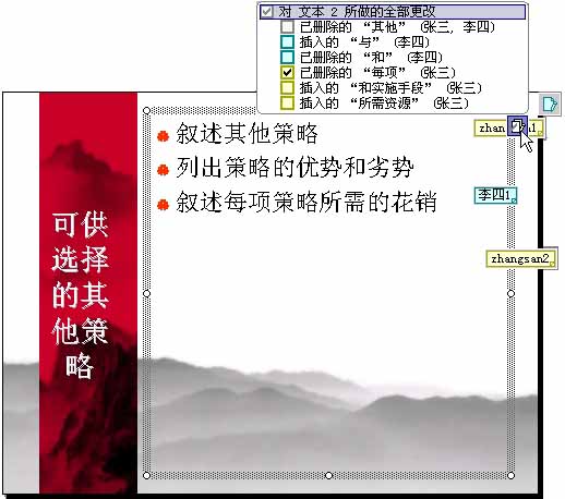 PowerPoint用户现在可以更容易地追踪对演示文稿所做的修订。“标记”功能允许用户使用标记追踪对演示文稿所做的修订。这些标记对更改的内容做了详细的描述,并不使原来的演示文稿模糊或影响其布局。它们也使用户对所做的更改有一种更全面直观的印象。用鼠标在相应标记上单击,其旁边就会弹出一个包含更改详细信息的列表框,在其中选择不同复选框,即可应用相应更改(图1)(