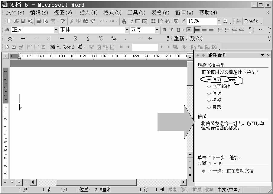2窗口的任务窗格中看到一个“邮件合并”向导,这里应该选择“文档类型”为“信函”,然后点击“下一步”按钮。