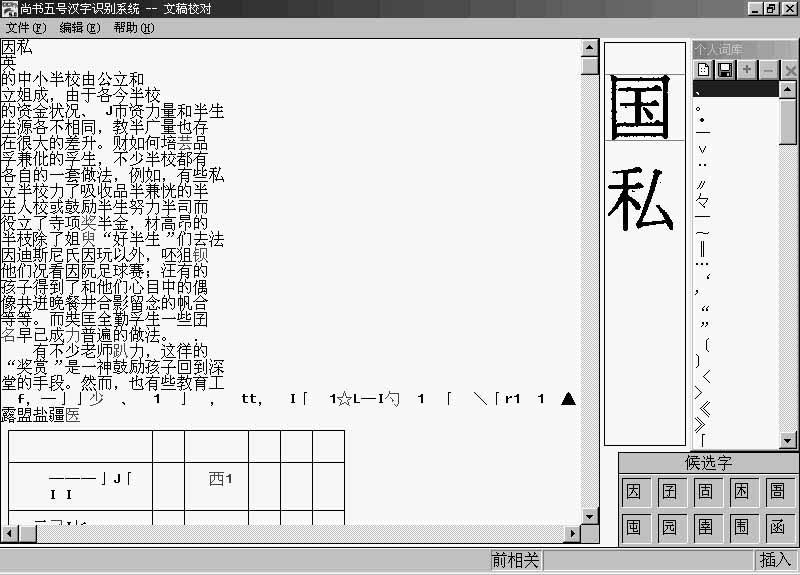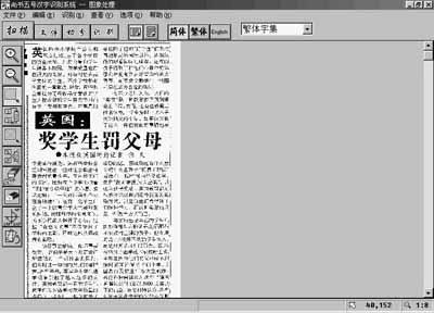 3 随后,可进行各种前处理功能,例如存储图像、划分识别区域、改变识别顺序及删除划分、对歪扭图像的自动/手动倾斜校正、图像旋转及对图像中杂点的清除、对所获得的图像的自动识别、文字切分、文字识别、放大和缩小图像、界面显示方式设定、文字纵横排列方式的设定、图像反转方式设置以及辨识字集的设定等。设置好后,按下“识别”按钮就会自动识别该图像中的字符,并出现在“文稿校对”窗口。(如图6)(