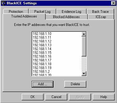 在这一项设置中,你可以输入你认为安全的网络地址,这样BlackICE就会把这些地址排除在监视和防护的网址范围以外。点击“Add”,输入一个你信任的地址。在共享上网情况下我们把所有局域网内部的IP地址输入以后,客户机就可以畅通无阻地使用共享上网了。