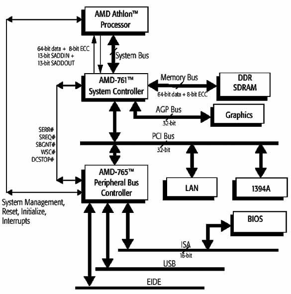 那么什么是总线呢?简单说来,总线就是一组进行互连和传输信息(指令、数据和地址)的信号线,它好比连接电脑系统各个部件之间的桥梁。另外,我们广义上通常也把AGP接口、USB接口等也称为AGP总线、USB总线。可以说总线在电脑中无处不在。如图所示是AMD的K7系统的系统结构与总线图。