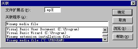 许多应用程序会在安装过程中,自动与某一类型文件建立关联,如安装ACDSee时,一般会与.bmp、.gif、.jpg等多种图形文件建立关联。安装完成以后,当我们双击.bmp文件时,系统将不再用Windows自带的“画图”程序进行处理,而是用ACDSee将其打开。值得注意的是,系统只认最后一个安装程序设置的文件关联。比如小愚以前安装Winamp时在.mp3和Winamp之间建立了文件关联,而当后来小愚安装超级解霸时,又为.mp3设置了用超级解霸打开的默认文件关联。这时系统按后安装的超级解霸为准,所以出现了本文开头出现的情况。