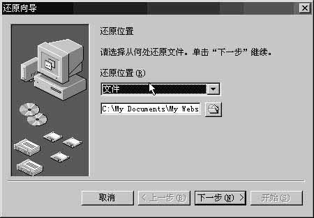当经过备份的源文件因意外情况而造成损坏或丢失,你就可以利用备份程序的还原功能将文件恢复过来。在图1所示的画面中选择“还原备份文件”,这时将出现如图所示的还原向导)(