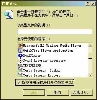 ),要求操作者在该窗口中选择一个应用程序来打开该文件,操作者在选择一个应用程序后,单击“确定”,注册完成,Windows就会启动所选择的应用程序去打开操作者要打开的数据文件。如果操作者在注册时选择的应用程序不对,则Windows系统会在屏幕上出现“该文件不能被某某程序打开”的提示。在“打开方式”窗口中进行注册时,还有一个选择项其作用很重要,即窗口下方的“始终使用该程序打开这种类型的文件”的选择项,在手工注册某类文件时,不选择该项,则注册只对本次使用有效;当再次直接打开数据文件时,Windows系统还要求选择应用程序,即注册文件类型。如果选择了该项,则注册长期有效,以后凡是在双击同类型的数据文件时,均用同一种应用程序打开。自动注册时,安装程序均选择该项。