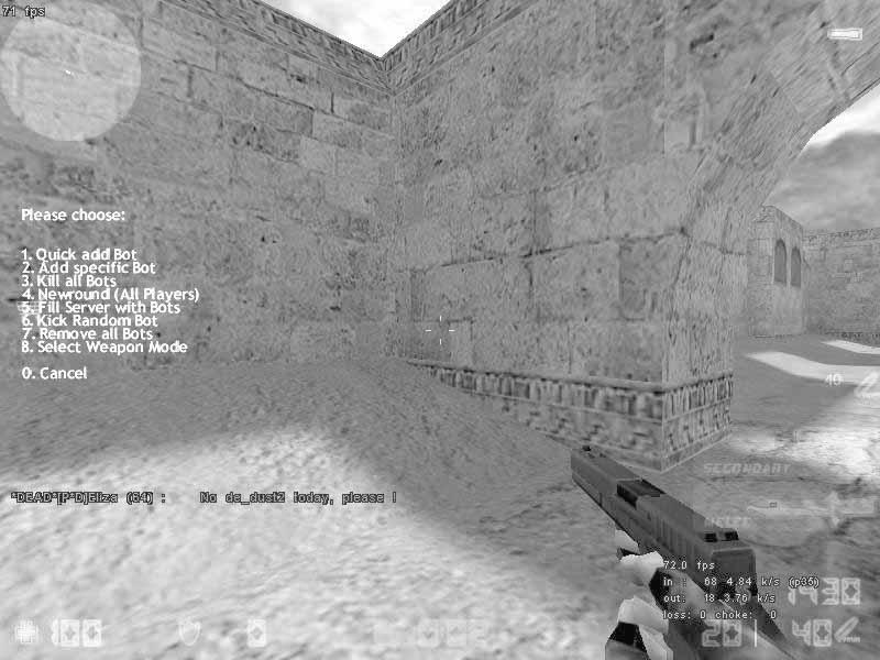),最好叫一名重火力、远射程、好枪法的CT在前面开道,后面跟上狙击手……”云云。说得好听一点这是CS的初级阶段模式,难听的话纯粹是纸上谈兵,不信的话可以试试,保险你死得很难看,弄不好还会被重狙打个串糖葫芦。如果一定要按照这种一厢情愿的打法,CT们只有祈求守在二楼窗口的狙击手是上帝精心挑选的一名菜鸟──毛手毛脚地开枪,痴痴不动地等待漫长的重新装弹,以便被CT轻易爆头。但是高手之争,NO WAY,SIR!
