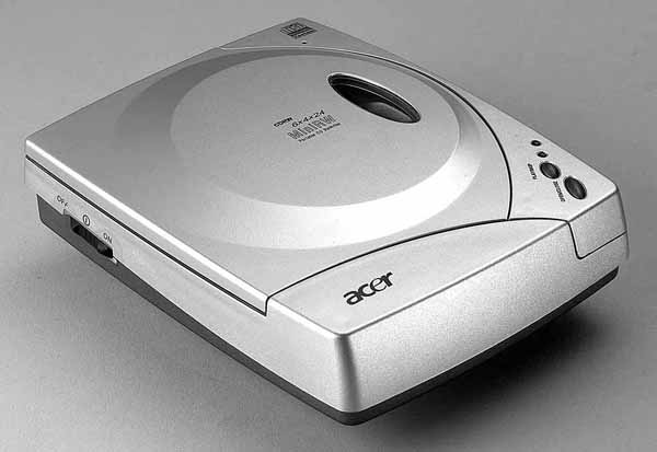 从外观上来看,这款外置刻录机比较小巧,尺寸只有134mm×39mm×165mm(宽×高×长)。如果把它放在显示器的旁边,第一次看到它的人往往会误认为它是外置MODEM(如图1)。它采用了银色的外壳设计,与目前流行的便携电子产品(如CD随身听、MP3随身听)相似,给人一种很时尚的感觉。这款刻录机的外壳上有几个控制按钮,分别是弹出光盘/停止播放、播放/跳过、电源开关,此外还有两个指示灯,绿色的指示灯表示读盘状态,红色的指示灯表示刻录状态,基本上与IDE内置刻录机的面板设计相同,只不过位置不同而已。对于这款刻录机的出盘与进盘设计,我们认为很出色:它采用了与CD随身听相同的翻盖、手取盘设计,但是却克服了一般CD随身听转轴卡盘较紧、取放不易的缺陷,将固定装置做在了顶盖上,并且在光盘边缘位置做了两个凹槽以便用手拿取。