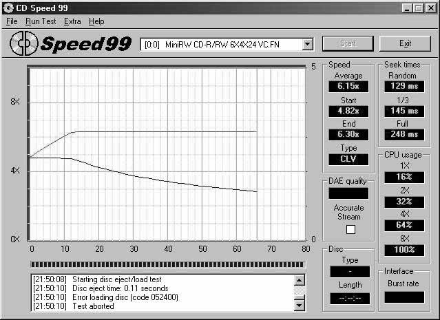 虽然这是一款刻录机,但是对于它的读盘性能我们同样要考察。我们采用了一张容量为600MB的《电脑报配套光盘》和一张容量为640MB的自己刻录的CD-R来进行测试。测试结果如图2。从图中可以看出,这款刻录机的最大读取速度为6.3倍速,大约为945K/s,无法达到其标称的24倍速,其原因在于刻录机与主机是通过USB接口连接的,USB1.1规范的最大连接速度为12Mb/s,即1.5MB/s,这还仅仅是理论上的数值,实际能够达到的速度通常不超过1MB/s,因此这款标称读取速度为24倍速的刻录机只能够达到6.3倍速就不足为奇了。我们测得的随机寻道时间为120ms~130ms,与其标称的120ms基本相符。在我们的测试中,该产品读取CD时的CPU占有率较高,1倍速、2倍速、4倍速时的CPU占有率分别达到16%、32%、64%。如此高的CPU占有率,恐怕只能用USB接口的工作方式来解释了,对于这个产品来说,我们无法通过IDE产品通用的打开DMA工作方式来改善其CPU占有率。这款产品带有播放键、耳机接口和外接电源,可以单独用作CD播放机,除了接在电脑上做刻录用外,又多了一种用途。