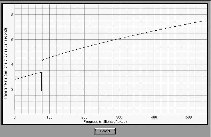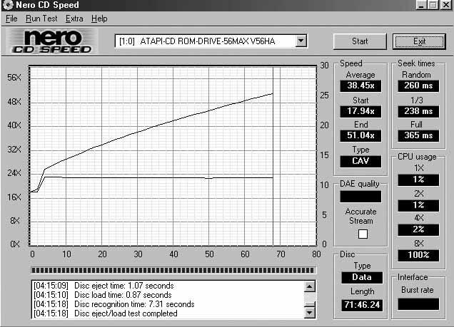 观察测试结果得知,在读取普通数据盘时该光驱的起始速度为17.95×,平均读取速度为38.48×,最终速度为51.04×。该光驱在这个测试中的最高速度大于CD WinBench 99测试中的最高速度证实了先前的推测──测得51.04×所使用的光盘容量为610MB,而测得50.66×所使用的光盘容量为527MB。从测试截图(