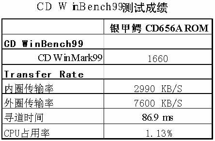 在CD WinBench 99测试中明基银甲鳄CD656A CD-ROM表现出了稳定、快速的特点,CD-ROM WinMark 99的得分达到了1660的分数。其中内圈传输率为2990KB/s,按照CD-ROM 1倍速等于150KB/s数据传输率来计算,内圈传输率达到了19.9×,而外圈传输速率的测试结果为7600KB/s,换算为倍速应该是50.66×。没有达到或接近标称值56×并不说明该光驱的读取速度上不了56×,请注意CD WinBench99测试光盘的容量──527MB,再从CD-ROM WinMark99的测试截图(