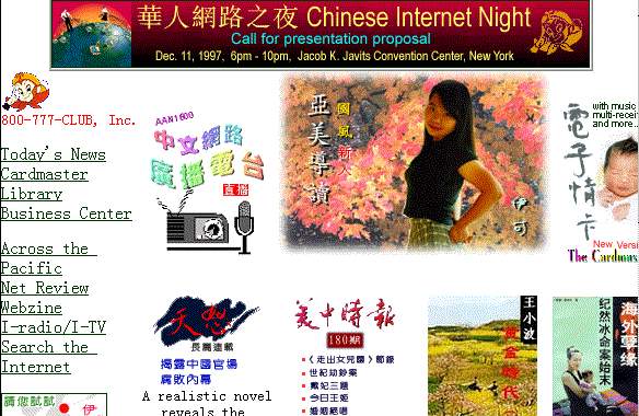 称为“亚美网路”,采用中文界面。下设“中华商城”、“万博专栏”等八个栏目。其中“电子情卡”栏目提供免费的网上送卡服务。卡片精美,设计独特,有生日卡、生肖卡、情人卡、父亲卡、母亲卡等,供你任意选择。“视听之窗”栏目汇集了亚美音乐之精华,任你欣赏。