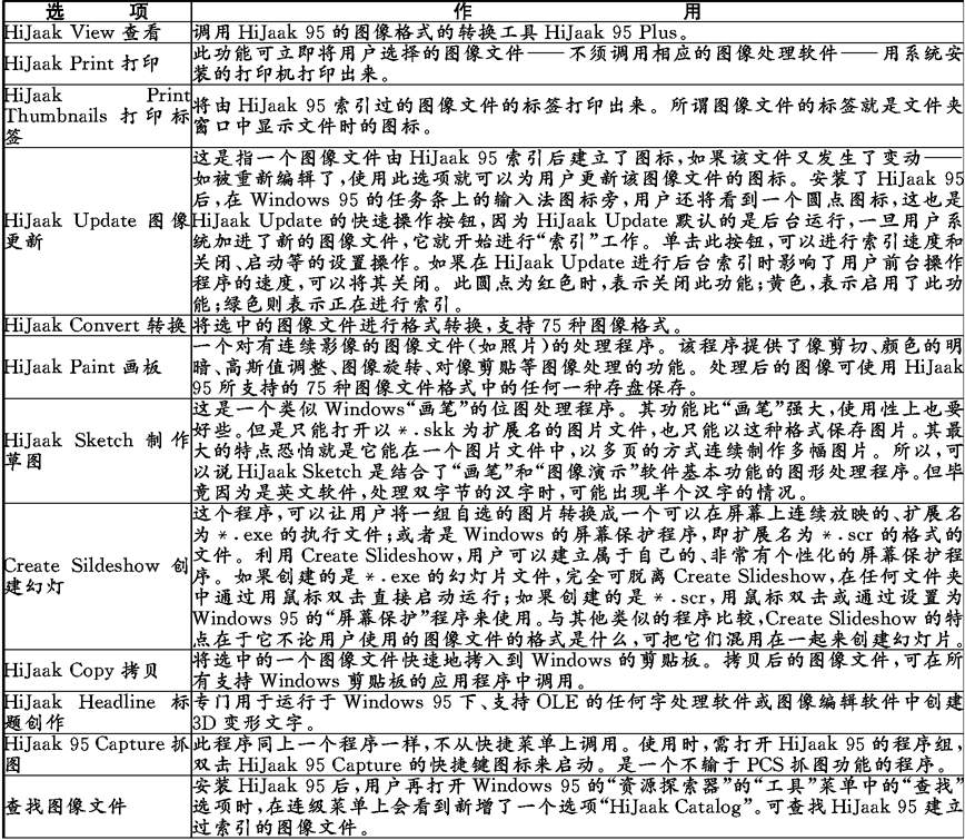 这一版本的HiJaak的正式命名为:HiJaak Graphics Suite 95(以下简称HiJaak 95)。新增功能中,可转换的图像文件格式达到75种之多。同时,还新增了浏览图像、打印像象文件、图像图标即贴(以图像文件本身的内容作为其文件图标)和索引、查找图像文件、编辑图像文件、创建3D文本文件的标题和制作幻灯片放映的图像文件(制作成可直接执行的文件或屏幕保护程序)功能。安装所需的硬盘空间为33MB。安装是比较简单的,这归功于HiJaak 95的安装程序能调用Windows 95的“安装导向”。根据“安装导向”的指引,一般用户都能很容易就完成安装。只是安装结束前,会出现一些更新Windows 95系统设置的选项。初用时,对这些选项的意义可能并不了解,那么就简单选用默认选项好啦。熟悉后,随时可通过Windows 95的“控制面板”中的“HiJaak Catalog Setup”选项对相关设置做修改。