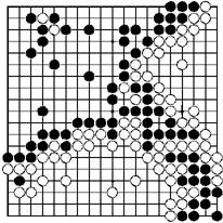 FOST杯赛上《手谈》遇到的强手只有《棋慧》和《GO4++》。对《棋慧》的一局是在败势下翻盘拿下来的,弄得陈克训连说《手谈》是《棋慧》的克星。对《GO4++》的一局符合我出国前的预想;《GO4++》善于围空和巩固空地,但不善于构成大模样,也不善于侵削对方的模样。我加强了《手谈》的围空和构筑大模样的倾向,以便围着比它更多的空。这盘棋,《手谈》(执黑)在左上方构成巨大模样以与《GO4++》的下边和右边两个大空相抗衡,一直保持不大的领先,终于赢了5目半(见图)。局后我对芮斯表示,他的程序进步很大。他说他今年用了全部的工作时间来搞围棋程序,并且有一位5段好手帮他改进布局和加入许多定式(他曾说他自己的棋力只有3级,以前《GO4++》只会走三三)。这次《GO4++》负于《手谈》和《棋慧》而仅得第三,未能如愿。他表示再作努力,争取11月在美国旧金山举行的应氏杯国际电脑围棋赛中取得佳绩。