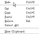 Edit(编辑)的下拉菜单见图3,从上到下意思为:取消取近的一次操作、剪切、拷贝、粘贴、删除、选择所有、查看剪贴板。