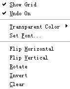 Option(选项)的下拉菜单见图4,从上到下意思为:显示/取消编辑区32×32像素的网格、解开、选择编辑域背景颜色(有16种颜色供选择)、输入汉字时选择字体和字样与大小、水平翻转、垂直翻转、反转颜色、清除画面。