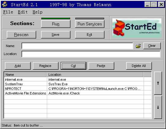 。例如:编排程序运行的顺序;增加、删除程序项。使用方法很简单:打开StartEd后,单击Rescan键。在表格中会显示所有“自动”执行的文件和路径。如果想调整它们的顺序,可以选中一项后,连续的按右边的上、下2个键即可。至于添加,可以输入文件的名称和路径;或是从资源管理器中拖曳过来。Run或RunServices的区别在于:RunServices中的程序必须在操作系统启动的时候就开始运行,如防毒软件;Run中的程序要在Windows初始化后才运行,即在RunServices中的程序执行后运行。