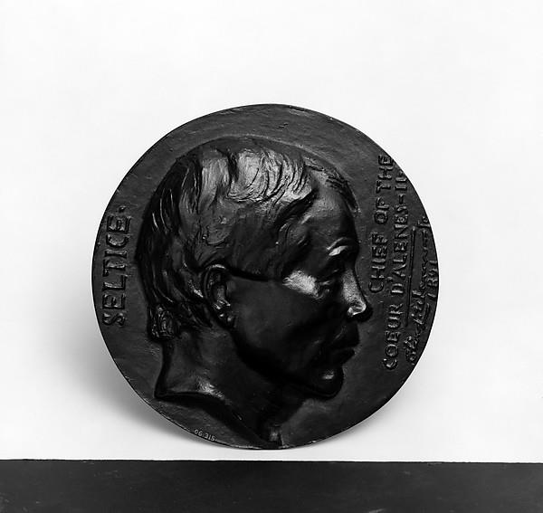 "Seltice, Chief of the Coeur d'Alenes" was one of seven portraits of Native Americans that Warner modeled in 1891 while in Oregon. At the time, Seltice, or Andrew Seltis, was in his late fifties. Though his mother was a Spokane, he became the chief of the Coeur d'Alene, or Schitsu’umsh.