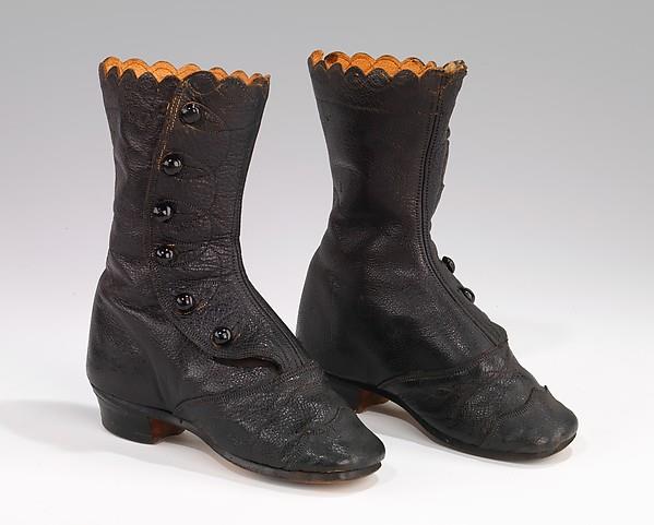这些高品质的儿童纽扣靴采用了顶部缝合的细节和扇形边缘,更具吸引力。在这一时期的许多例子中都可以看到纽扣上的上缝线的环形设计,它既是对扣孔的装饰性增强,也是对扣孔功能的增强。扇形上衣是一个主要局限于童装的特色,短裙可以让人看到这样的细节,也可以反映内裤的装饰底边。